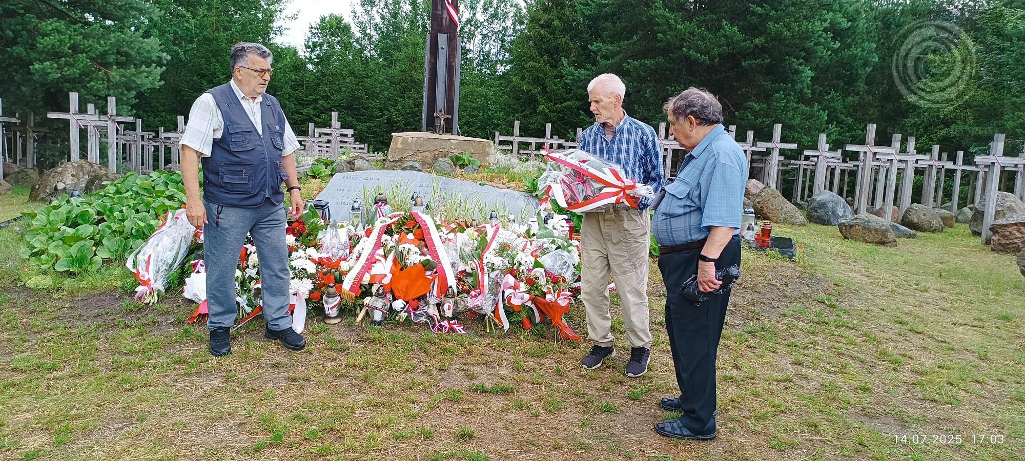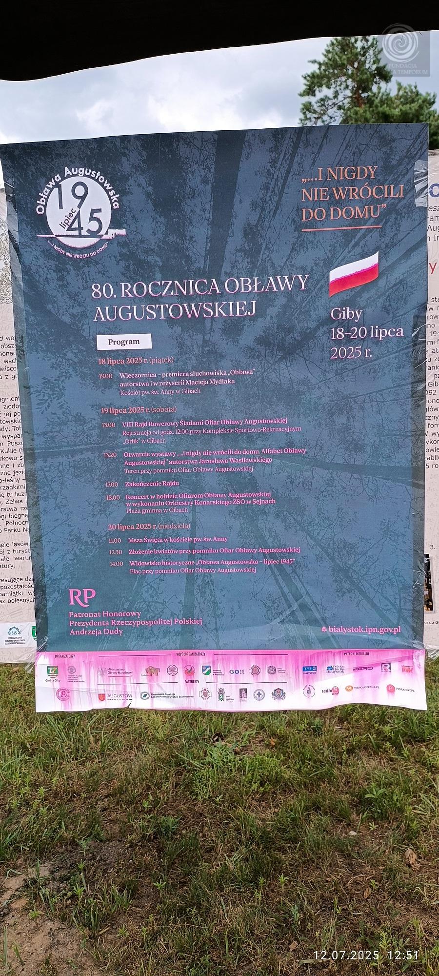Coroczne odwiedziny naszych kolegów mieszkających obecnie w Suwałkach (Janusz Skowroński) i we wsi Remieńkiń (Stanisław Karpezo) czasami zbiegają się z lokalnymi uroczystościami lub imprezami o których słychać w całym kraju. Kilka lat temu było to „Święto siei”. W tym roku nasz przyjazd pozwolił nam uczestniczyć w uroczystościach upamiętniających 80-tą rocznicy „Obławy Augustowskiej” nazywanej często „Małym Katyniem”. Można było o niej usłyszeć w tych dniach chyba we wszystkich mediach. Patronat nad uroczystościami trwającymi 3 dni (od 18 do 20 lipca 2025) objął Prezydent Andrzej Duda. Niby sukces miejscowych patriotów i krewnych pomordowanych w wyniku „obławy” ale widzieliśmy też, że oprócz senatora Komornickiego i posła Zielińskiego pochodzących z tych stron nikt z poprzedniego rządu PIS ani z obecnego nie pojawił się na uroczystościach. Bliżej im było do Częstochowy i bliższych Warszawy miejsc gdzie mogli spotkać kamery tv i wygłaszać „jedynie słuszne poglądy”. Tam wyraźnie widać było , że politycy z Warszawy zajmują się głównie sobą, a media żyją z ich pokazywania. W uroczystości wzięliśmy ( J.Skowroński, St. Karpezo, J. Kaniewski) udział jako delegacja Fundacji Signa Temporum.